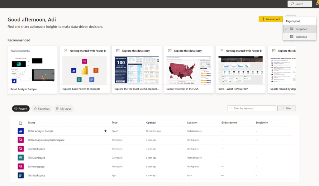 In March 2022, we are switching all Power BI service users to have the new simplified layout by default. The previous layout (aka Expanded layout) will still be accessible via the layout switcher on Home. A user’s selected layout will persist for subsequent visits to Home.