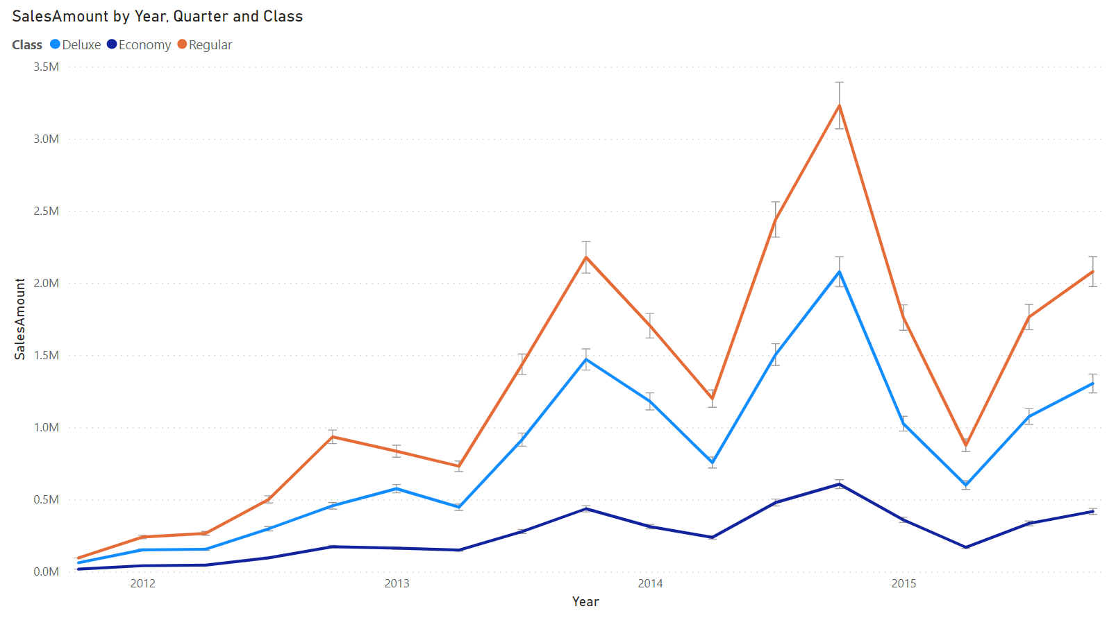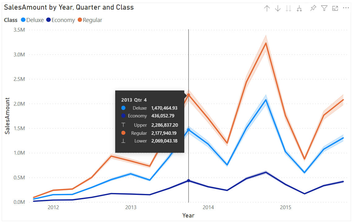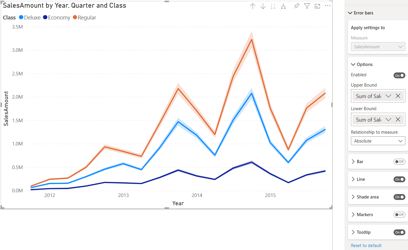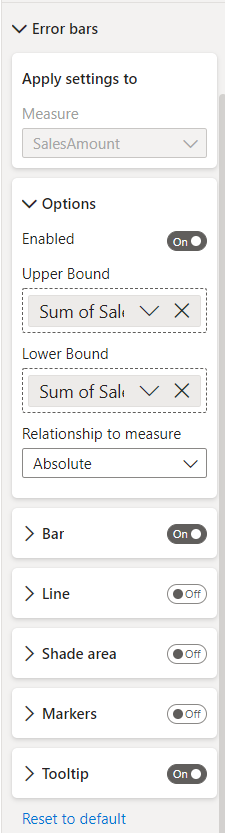 In the Analytics pane, you will see a new Error bars card. At the top, you’ll see a dropdown to select the measure to which you would like to add error bars. Beneath it, you’ll find options to enable error bars for this measure, add upper and lower bound fields, and indicate how the upper and lower bounds relate to the measure. Absolute means that the fields contain the exact value of the upper or lower bound, while Relative means that the fields contain the difference between the upper or lower bound and the measure. For example, if at one point my measure has a value of 60, an upper bound of 90, and a lower bound of 45, my upper bound field in absolute terms would be 90 and my lower bound 45, while my upper bound in relative terms would be 30 while my lower bound would be -15. Choose the option which suits the format of your upper and lower bound fields.