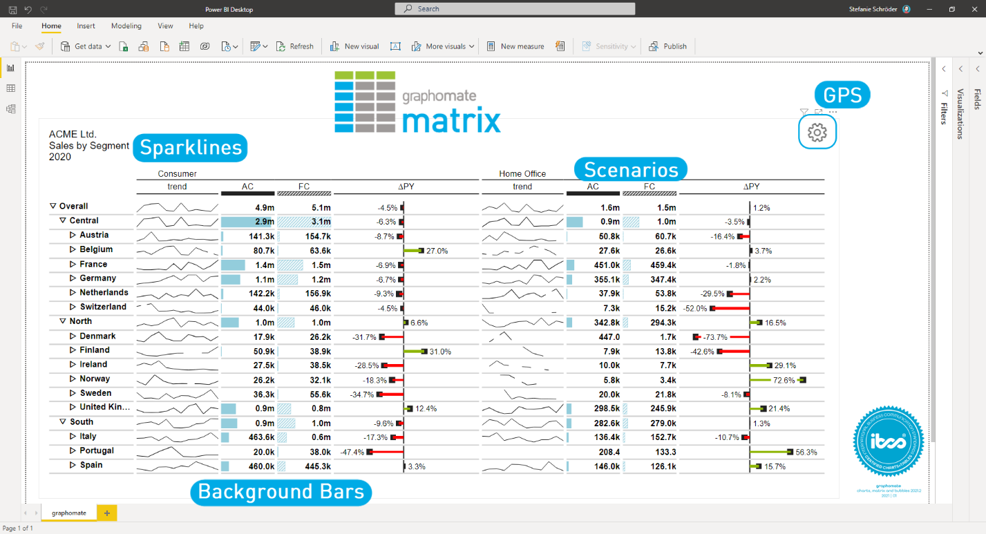 Benefit from the seamless integration of our custom visuals and use filters and slicers side by side with the standard visuals. Go ahead and try the graphomate matrix by downloading it from the AppSourceDetailed documentation.