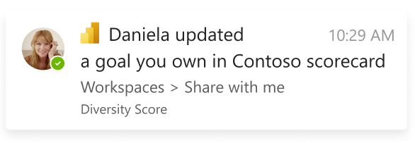 Note that the recipient needs to have the Power BI app for Microsoft Teams installed and have access to the corresponding scorecards to get these notifications. Read the documentation to learn more.