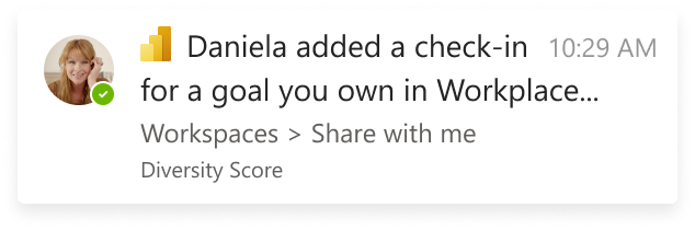 Goal update notifications are sent when a goal is updated. The goal owners receive a Teams notification from the user updating the goal if they have the Power BI app for Teams installed. They’ll get a notification right in the activity feed and as a banner (toast card). When they click the notification, the scorecard opens and the Details pane for the goal is shown. This notification will be sent on any of the manual updates to the goal such as changes to goal name, start/due date, adding or removing owners, adding, or changing status rules.