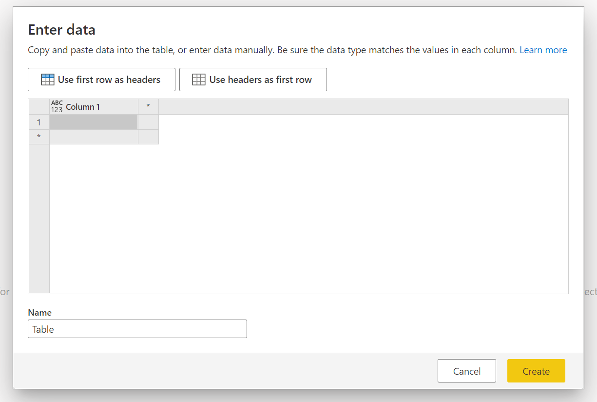 You can also add and remove columns from the context menu, and if your pasted data includes a header row you can click Use first row as headers to automatically promote the first row to the header row. Power BI will automatically detect the data types, but you have the option to manually set them through the data type button to the left of the column name.