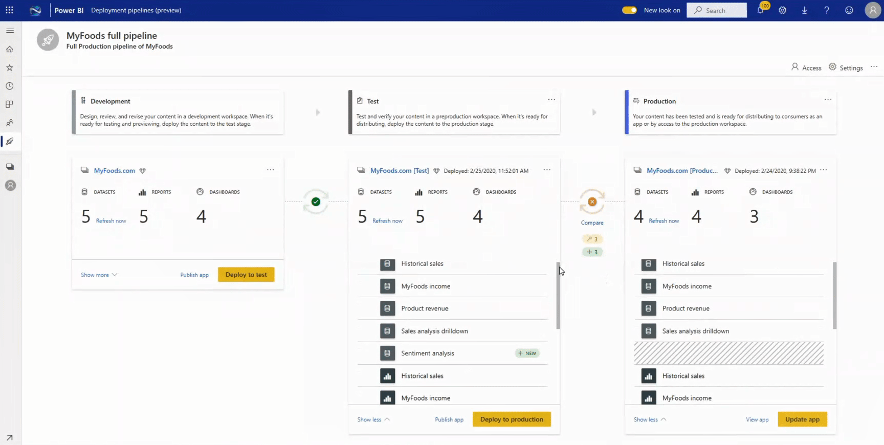 - Application lifecycle management2 – Deployment pipelines (preview) allows content creators to improve Power BI content publishing efficiency and accuracy by moving it through development, test, and production environments.