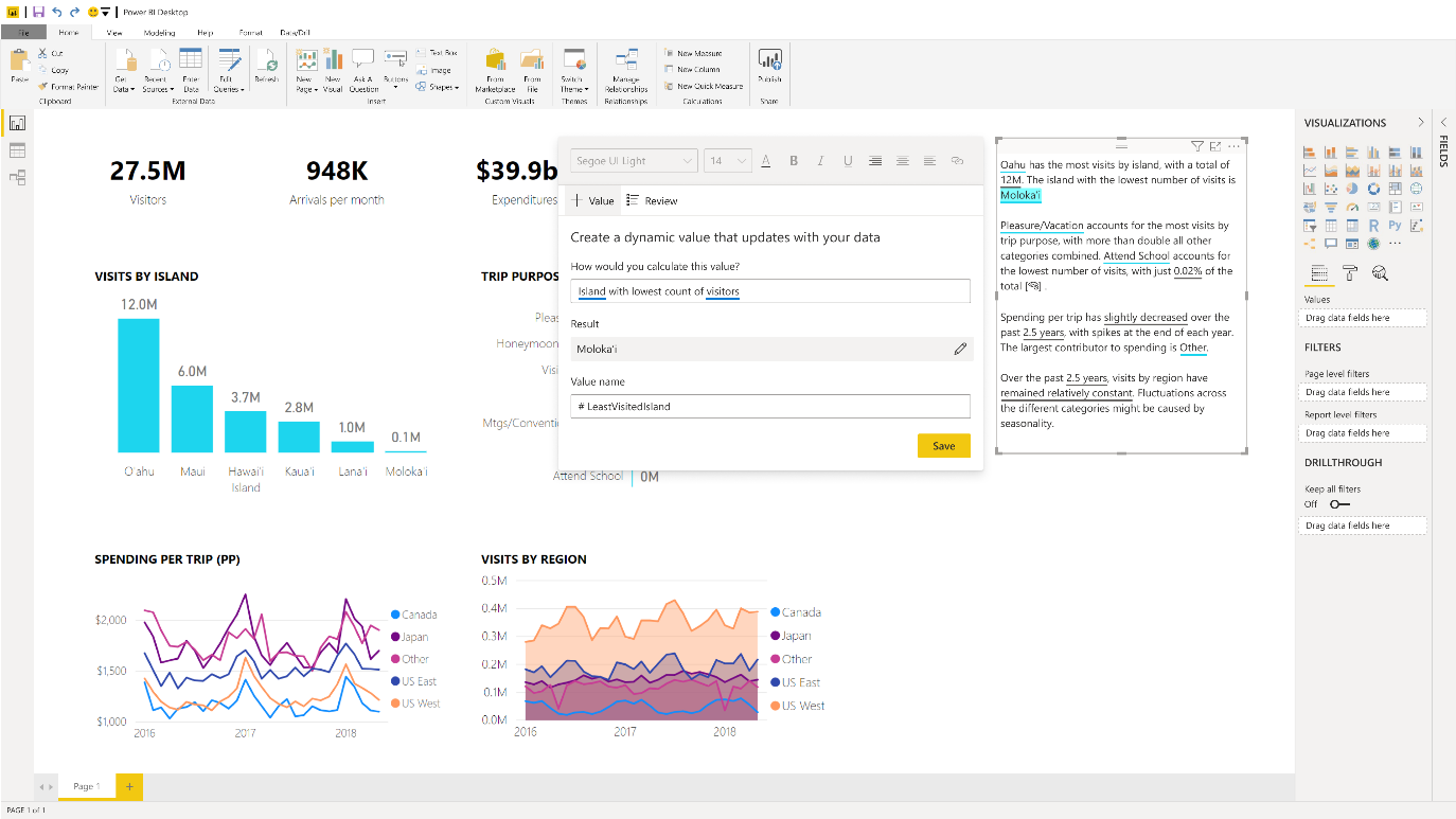 - Smart narratives (sneak peek)3 – report authors will be able to add and tailor dynamic, interactive narratives to reports that are automatically generated by Power BI. End users get clear explanations that are continuously updated as they slice and dice the data.