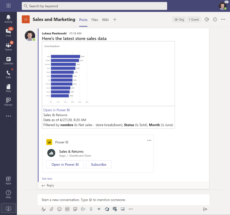 - Updated experiences with Microsoft Teams (Preview)1 – new Power BI tab and preview links allow teams to foster a data culture and make data driven decision making become part of their routine.