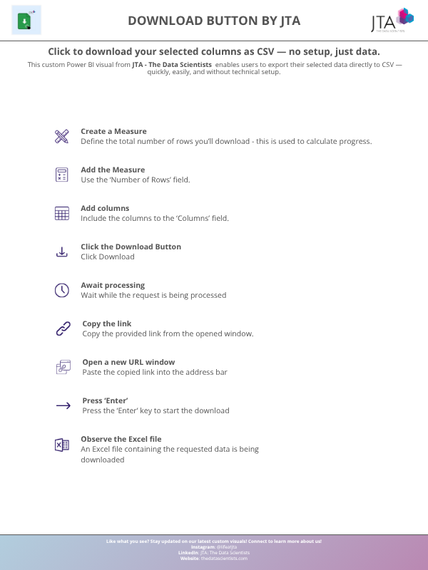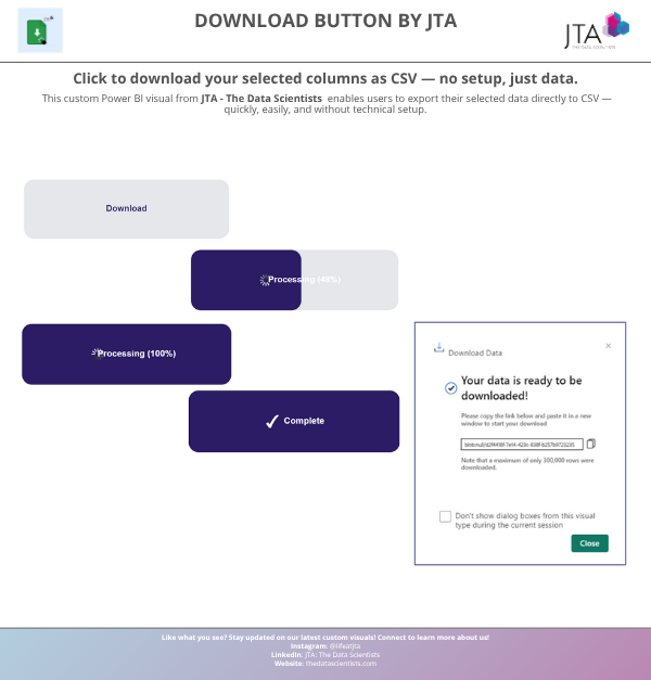 The “Download Button by JTA” is a custom visual designed specifically for Power BI users, empowering them to export large datasets effortlessly.