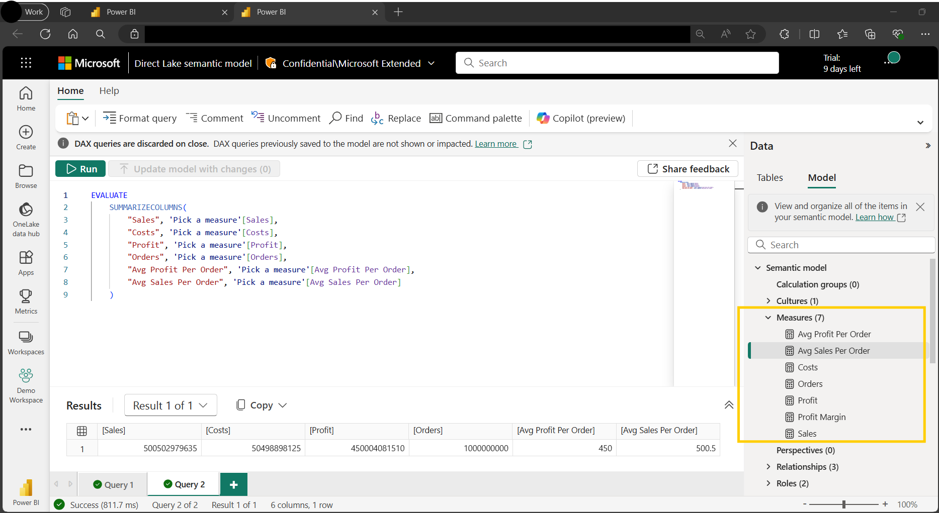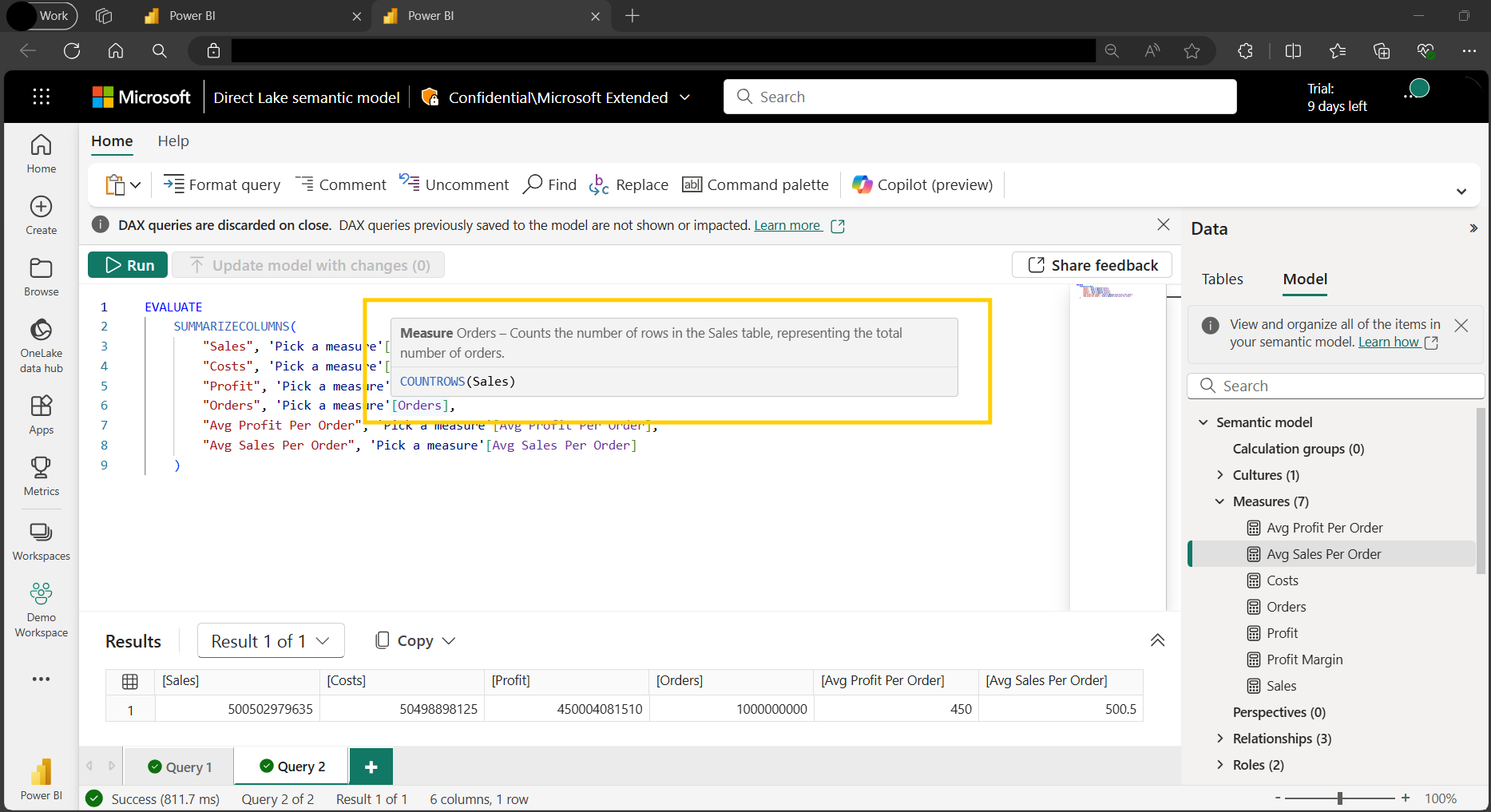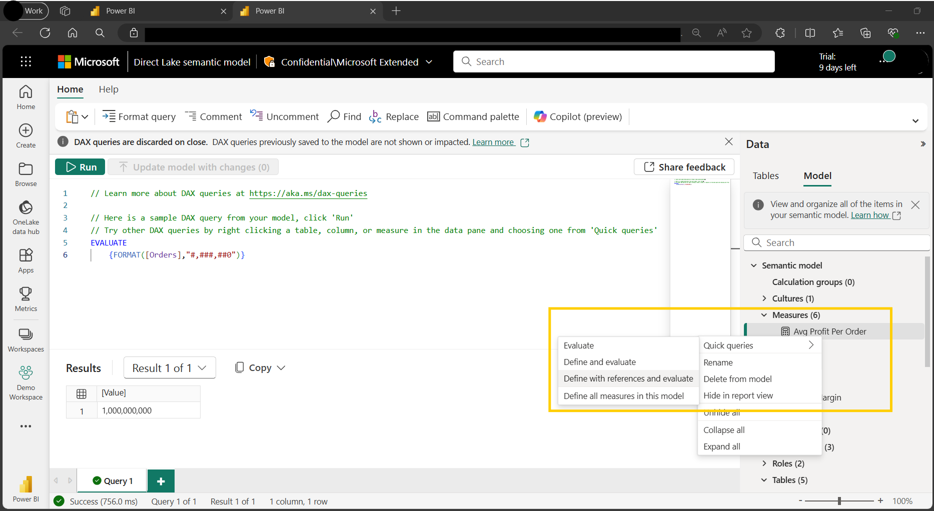 1. This demo semantic model has one billion (1,000,000,000) orders in the Sales fact table, one for each row. I already have a measure called Avg Profit Per Order which I can use the Quick queries in the context menu to Define with references and evaluate to see not only this measures DAX formula, but also the measures referenced in this measure with their DAX formulas.