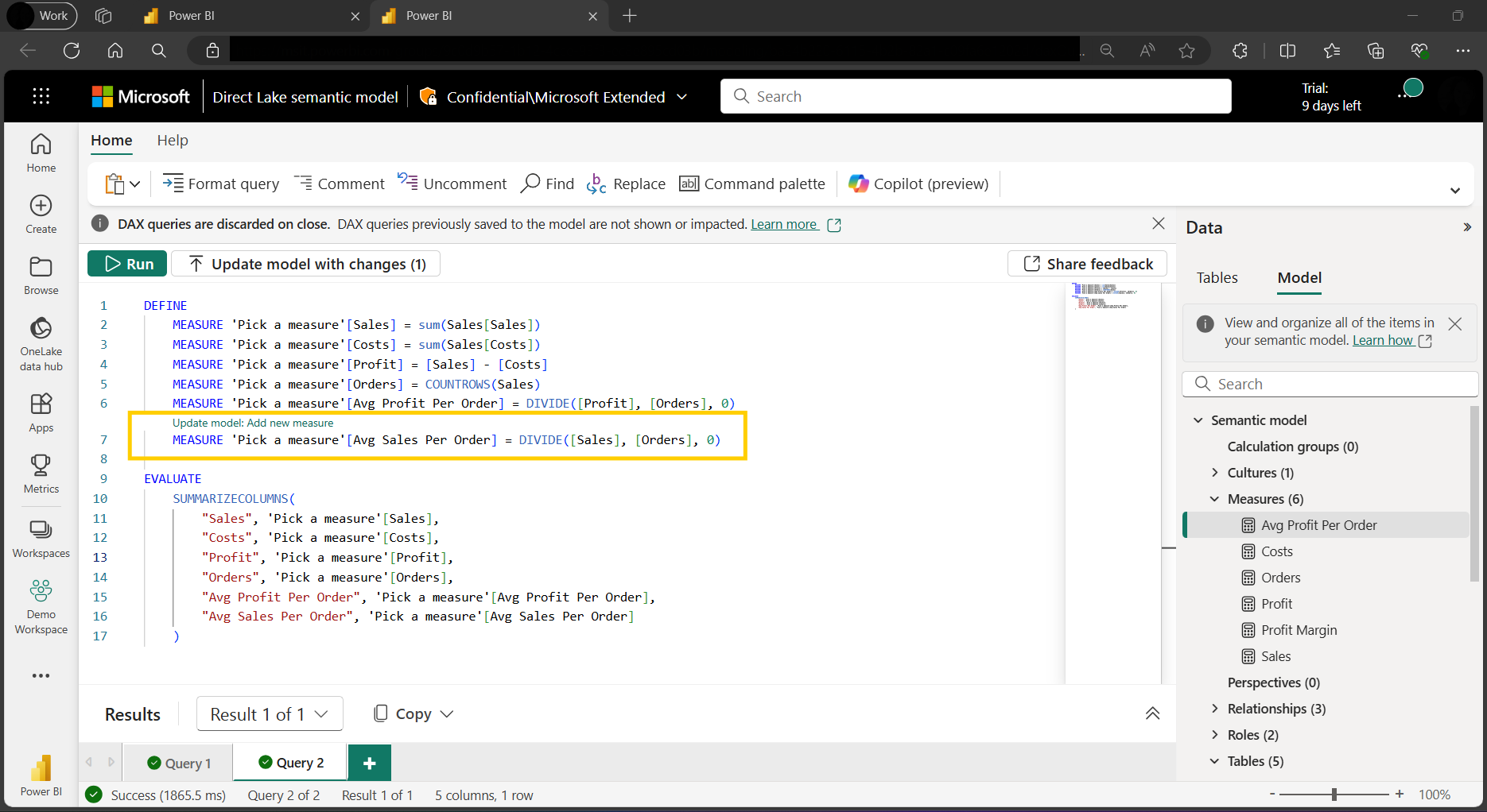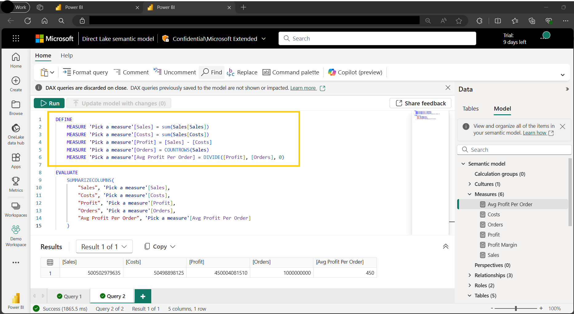 2. DAX query view converts these model measures to query scoped measures, and I can not only see all 5 of these measures used to calculate Avg Profit Per Order, but I can also make changes. These changes can be seen when I Run the DAX query but will not impact the existing measures in the model until I am ready to convert them back to model measures.