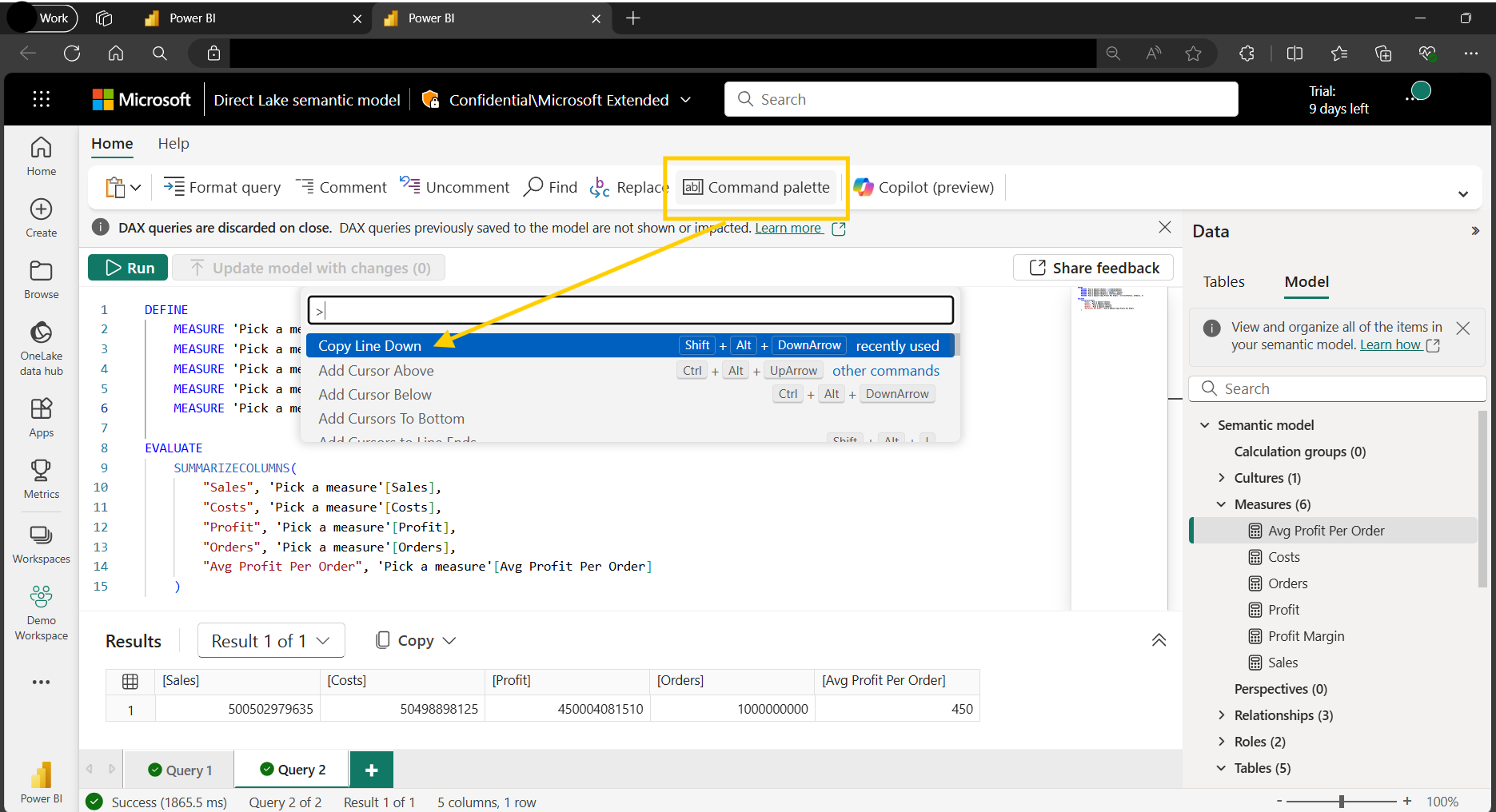 3. I want to create a new measure to show the Avg Sales Per Order. This will be the same DAX pattern as Avg Profit Per Order so I want to first copy it then modify it to be for Sales. I can use the Command palette to find the shortcut to Copy Line Down to help me with this task.
