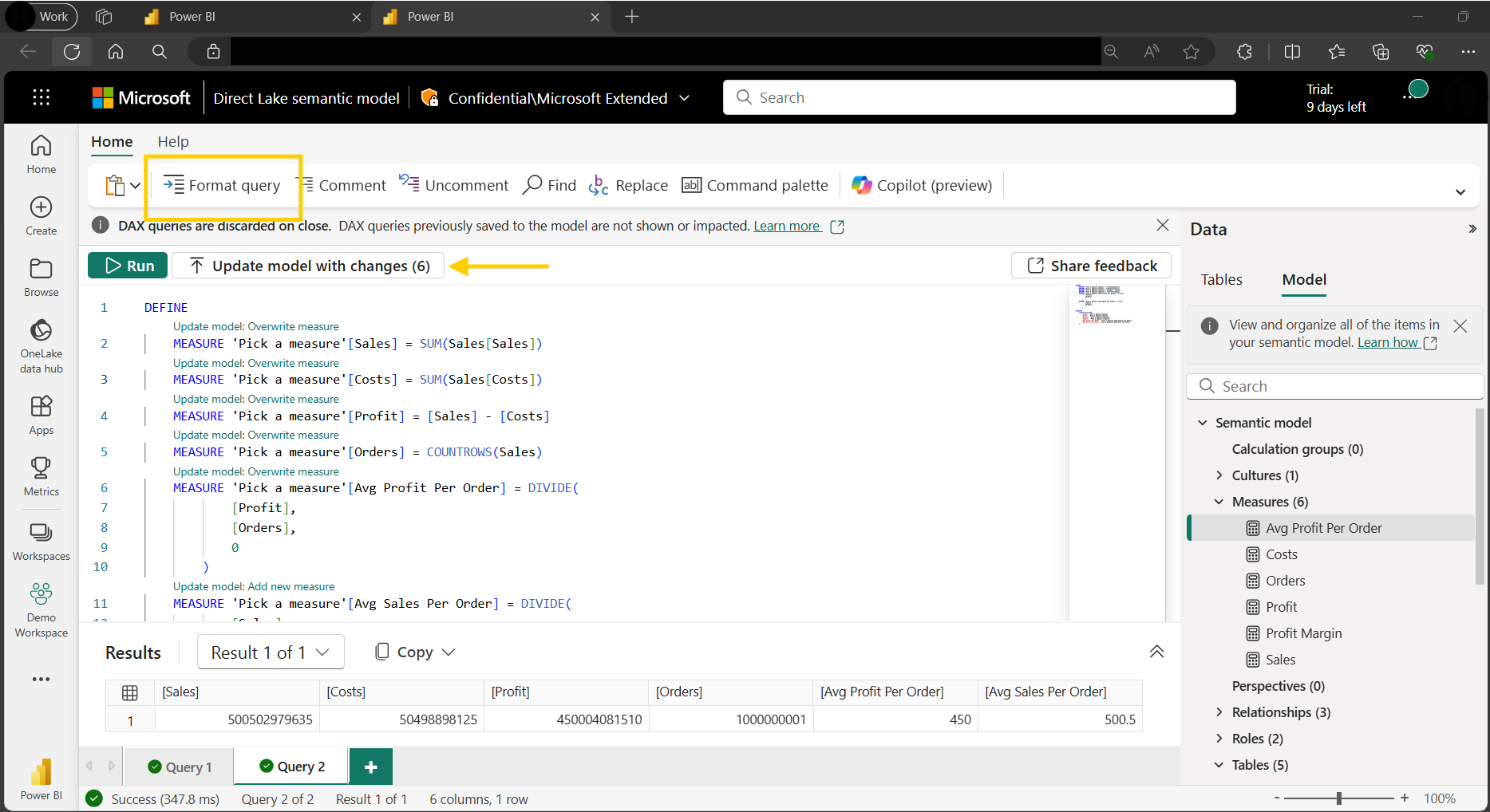 5. I can test out this additional measure by clicking the Run and I see the result is as expected. I can also take the opportunity to improve the readability of all these measures with Format query ribbon button. I am happy with all the changes I have made and now I can use the Update model with changes (6) button to see I have 6 measure expressions that differ from the model expressions and to update them in a single click.