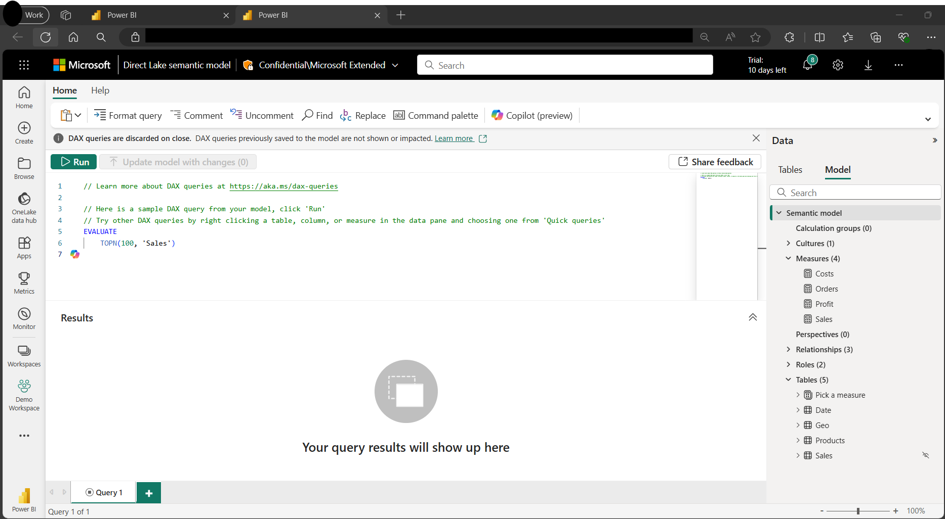 • Write DAX queries requires write permission on the semantic model. Workspace viewers will not be able to write DAX queries using this web experience in this milestone. Future updates will allow viewers to write DAX queries, but for now they will still have to use Power BI Desktop with live connection to the semantic model.