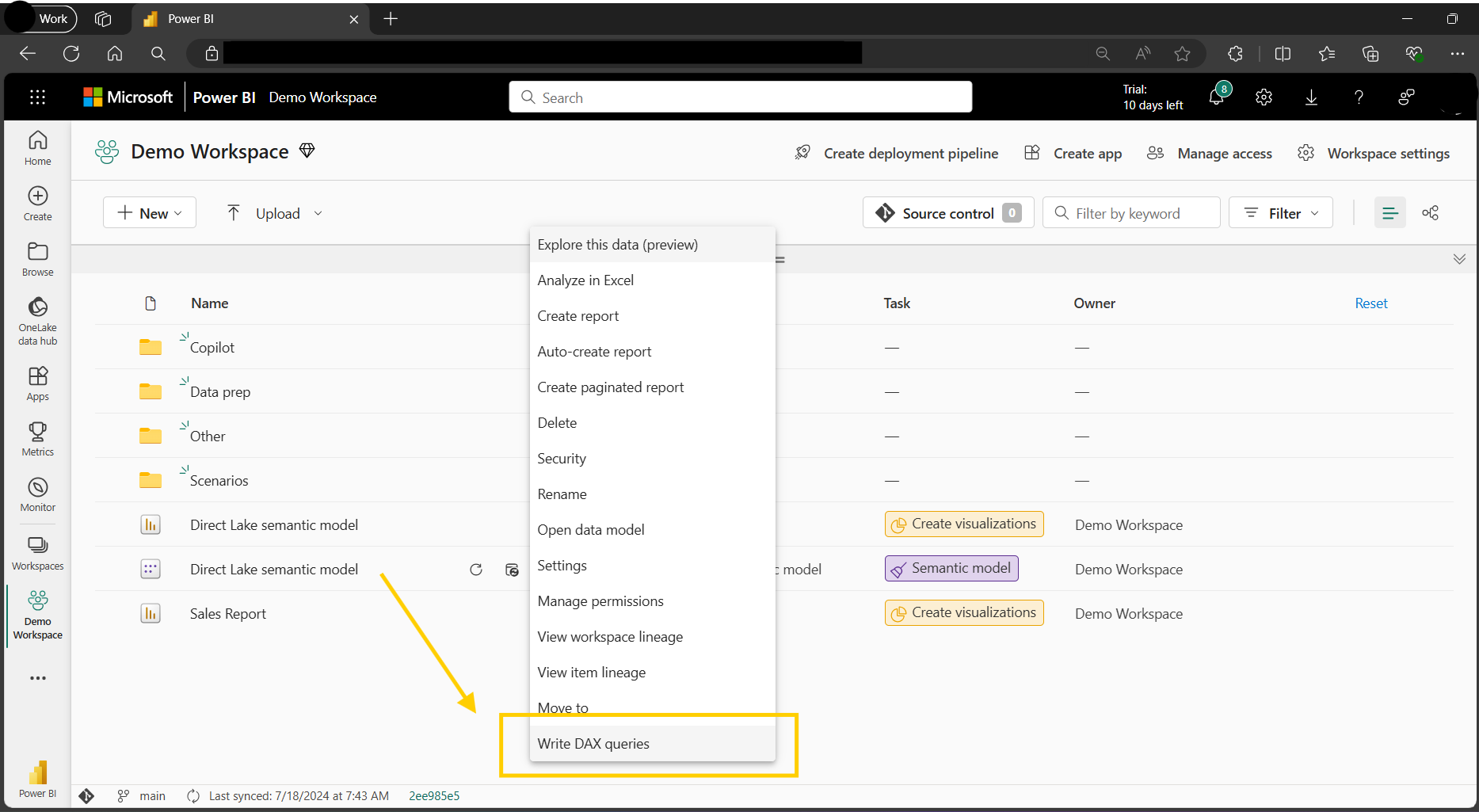 2. Click on Write DAX queries from the right-click, or context menu, on a semantic model in the workspace.