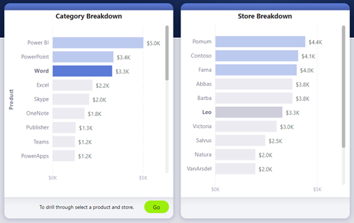 So in this example, the user would need to select a Product, Store, and destination page before the drill through button is enabled: