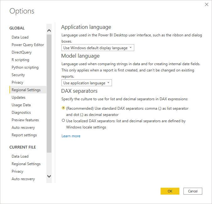 Behind the scenes Power BI would convert your localized DAX to the standard separators required by the AS engine before saving. At times, this led to some confusion and made it hard for customers in different regions to easily share DAX snippets. So as an improvement, we now default to the standard DAX separators. If you want to default back to the list separator and decimal symbols defined by your machine’s Region settings, you can find this DAX separators option under Options and settings > Options > Global > Regional settings: