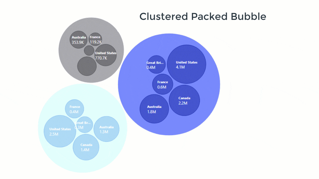 Packed bubble chart by xViz is similar to a bubble chart except that the bubbles are tightly packed rather than spread over a grid of X and Y-axis.